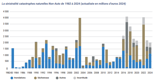 La sinistralité Cat Nat (hors automobile) sur la période 1982-2024 s’élève à environ 61,2 milliards d’euros (valeur actualisée 2024). Cela représente une moyenne annuelle de 1,42 milliard d’euros, mais cette moyenne masque une forte augmentation depuis 2016. En effet, sur les neuf dernières années, seule l’année 2021 a été en dessous de cette moyenne. L’année 2024, bien que marquée par une sécheresse modérée, a connu une sinistralité élevée estimée à plus de 2 milliards d’euros, en raison notamment du cyclone Chido et d’une sinistralité attritionnelle record.