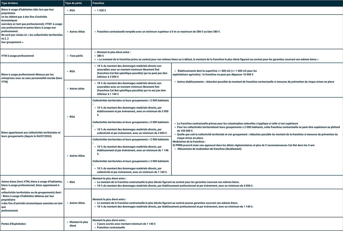 Pour les biens à usage professionnel détenus par les entreprises avec ou sans personnalité morale (hors véhicules terrestres à moteur), le montant de la franchise RGA sera égal au montant le plus élevé entre la franchise contractuelle (franchise Cat Nat spécifique possible) et 10% du montant des dommages matériels directs avec un montant minimum de 3 050 €. Pour les autres aléas, la franchise applicable correspondra au montant le plus élevé entre (là encore) la franchise contractuelle (franchise Cat Nat spécifique possible) et 10% du montant des dommages matériels directs avec un montant minimum de 1 140 €.