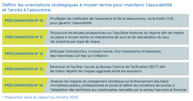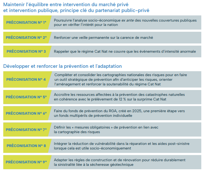 Les quatorze préconisations présentées dans ce rapport s’inscrivent dans cette logique: maintenir un juste équilibre entre marché privé et intervention publique, renforcer la prévention et l’adaptation, et garantir l’accès effectif à l’assurance pour l’ensemble des citoyens.